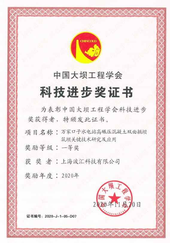 2020年11月,中国大坝工程学会表彰中国大坝工程学会科技进步奖获得者,为获奖者颁发“科技进步奖”证书。波汇科技获此殊荣,奖项等级为一等奖,本次获奖项目为万家口子水电站高碾压混凝土双曲拱坝筑坝关键技术研究及应用。
